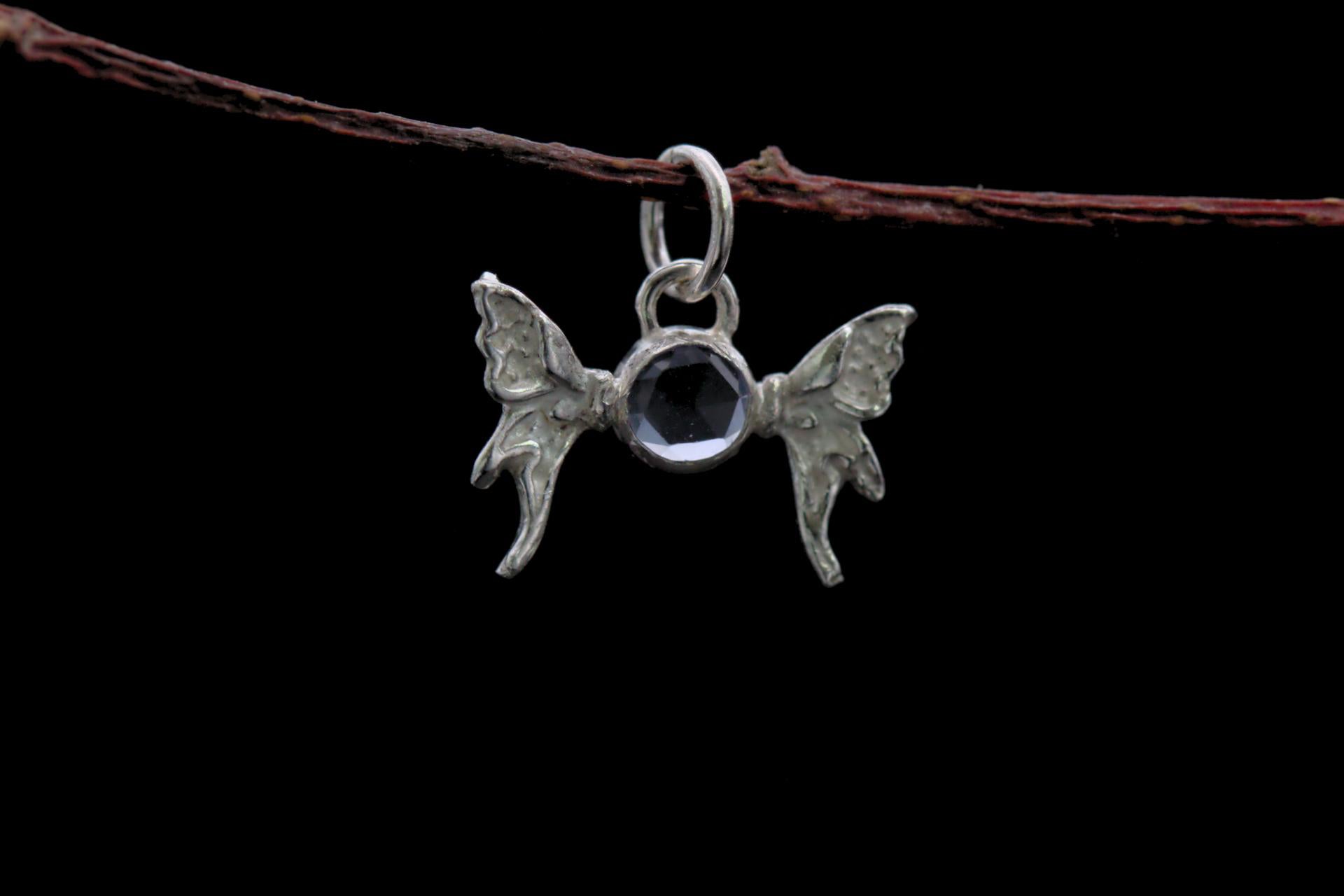 This little faerie pendant is deserving of a magical home. It features delicate little wings and beautiful rose-cut Iolite stone, which has a light purple colour when you get the right light!