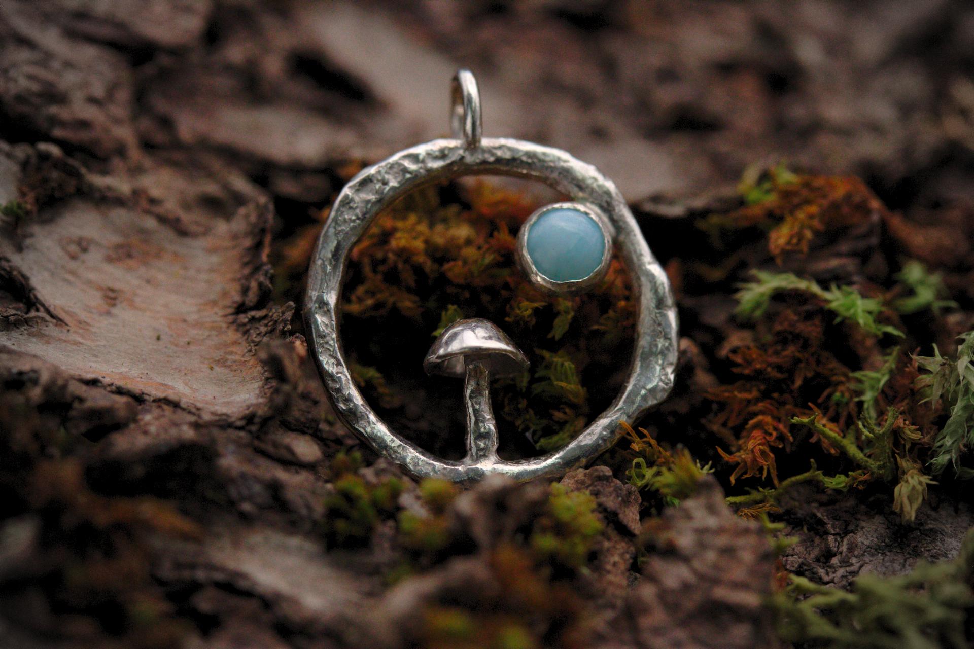 This pendant features a molten ring with a small fungi sat at the bottom with a beautiful blue Larimar stone set above it.