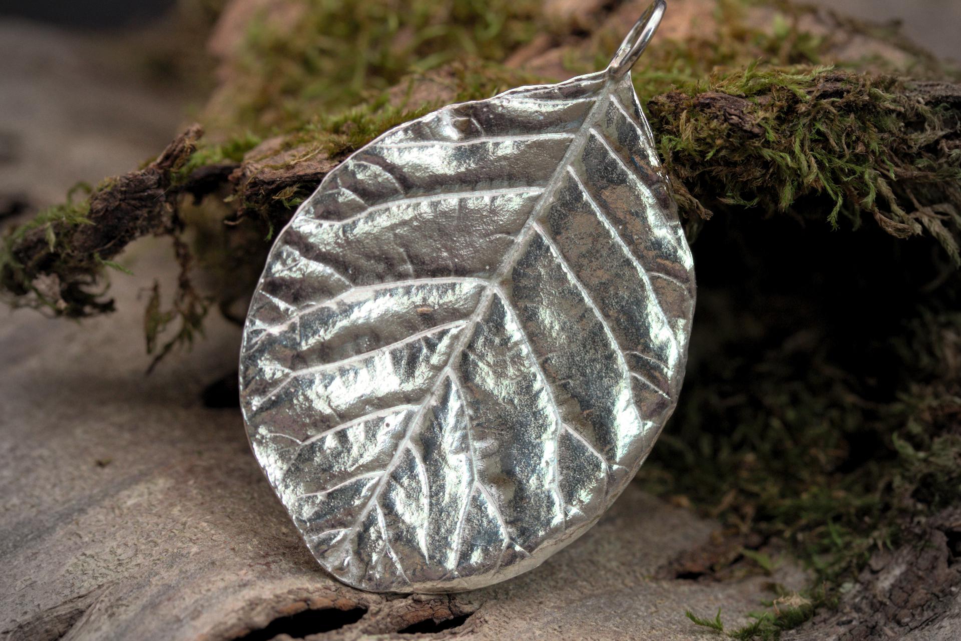 A beautiful sparkling Smoke Bush leaf pendant created by adding silver clay onto a real leaf.