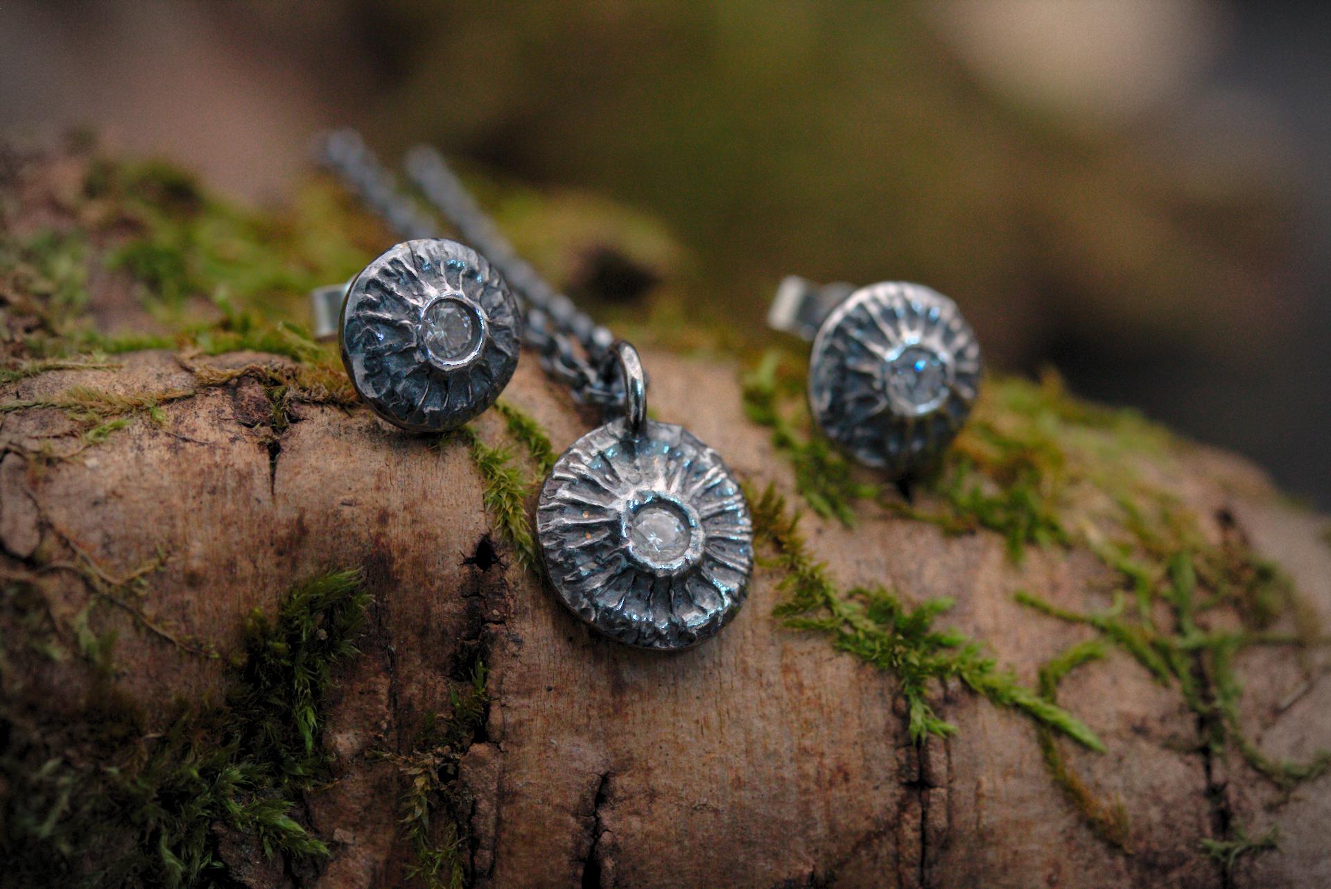 These pieces were created using precious metal clay which turns into 99% pure silver once fired. They have an interesting texture from the poppy seed pod that was used. The earrings and pendant all feature a tiny 2.5mm Cubic Zirconia gemstone in the centre. The set is finished with a patina which enhances the detail from the seed pod impression.
