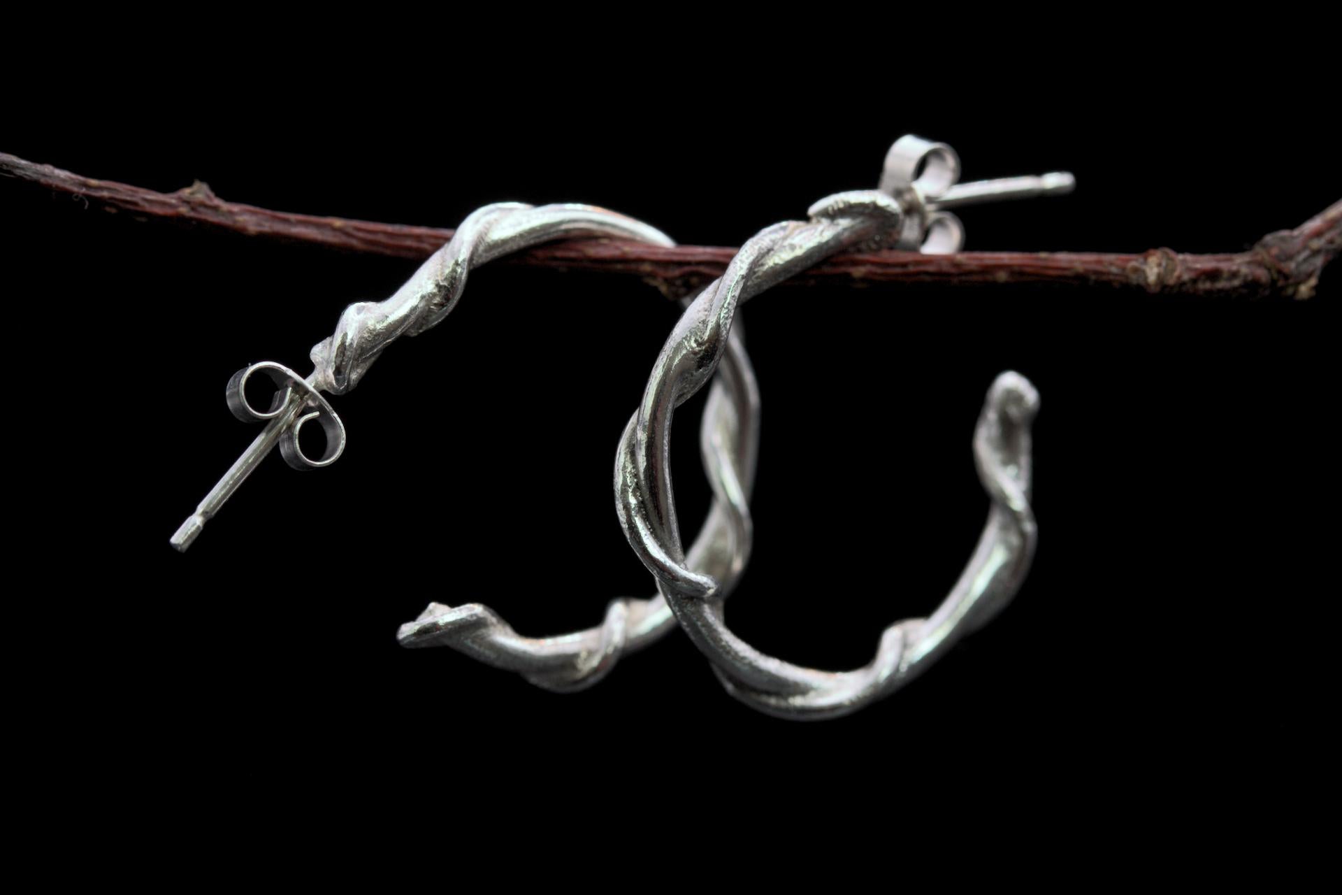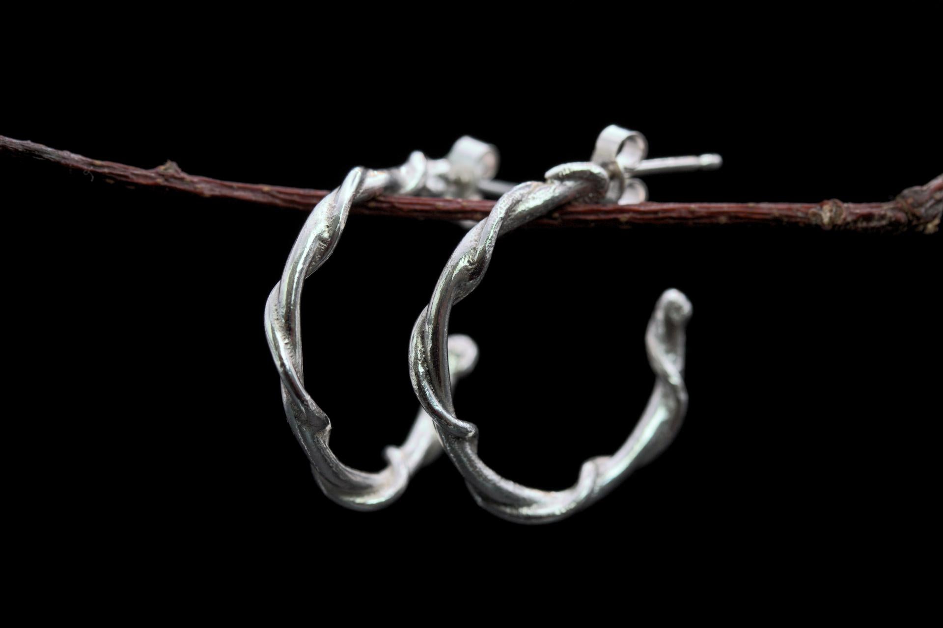A simplistic but whimsical pair of sterling silver hoop earrings with a twisted vine design.